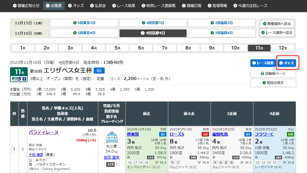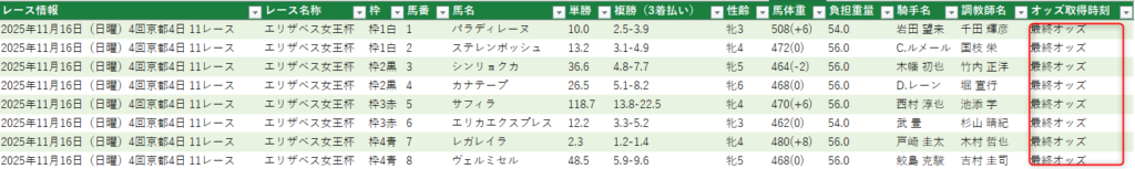 例として、2025年11月16日(日)に開催された、エリザベス女王杯のオッズを取得してみます。