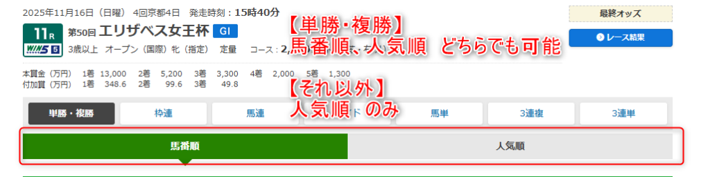 単勝・複勝は馬番順でも人気順でもオッズ取得は可能なのですが、
